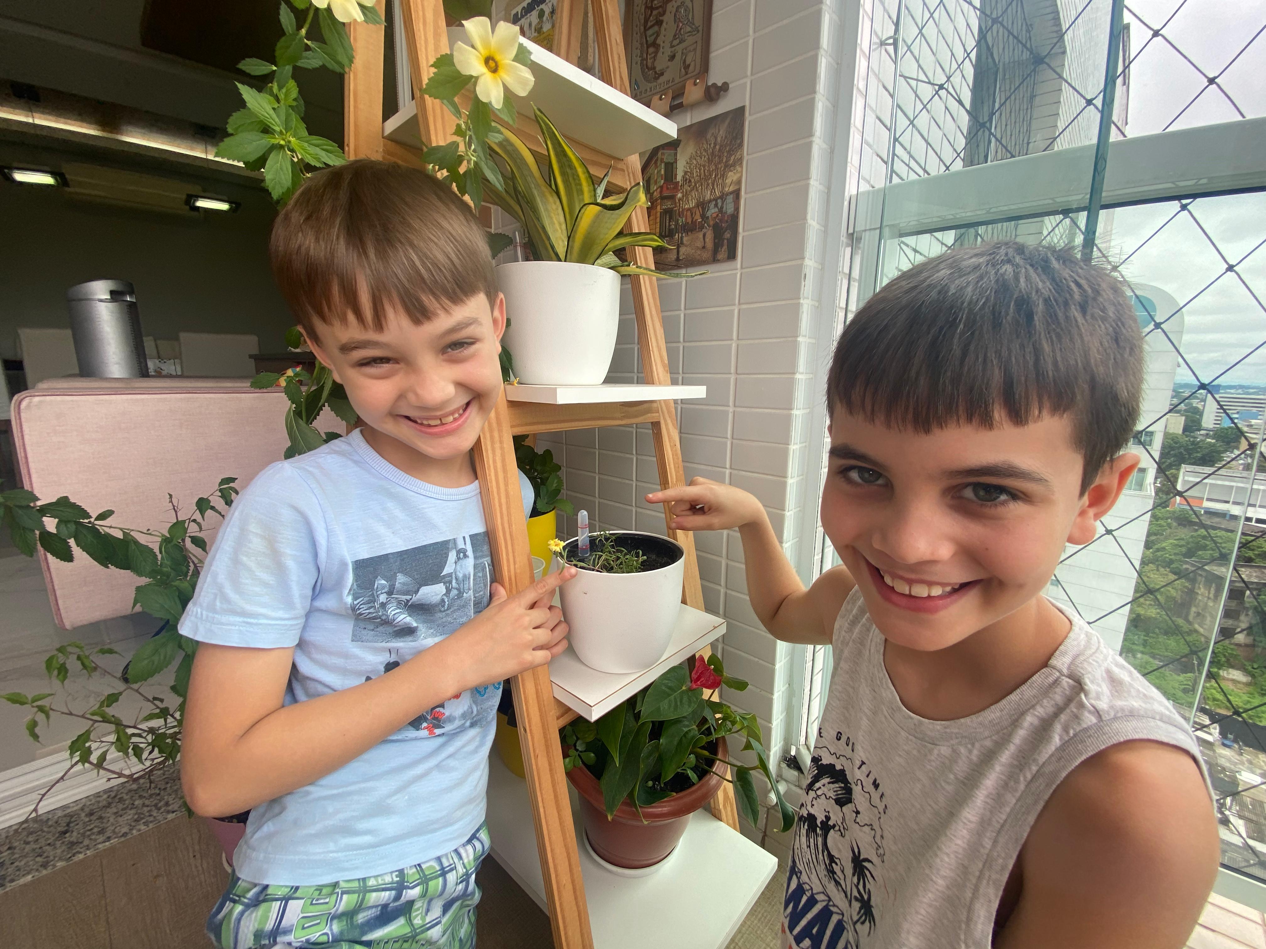 Aqui na foto aparecem dois menininhos lindos apontando para uma florzinha delicada. E eles têm motivo para estar bem felizes com esse florescer.